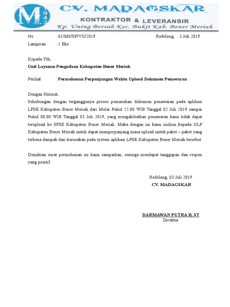 Surat Permohonan Perpanjangan Waktu Upload Dokumen Penawaran Pdf